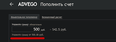 Пополнение произошло на сумму 13,50 так как Адвего забирает свой процент за предоставление сервиса